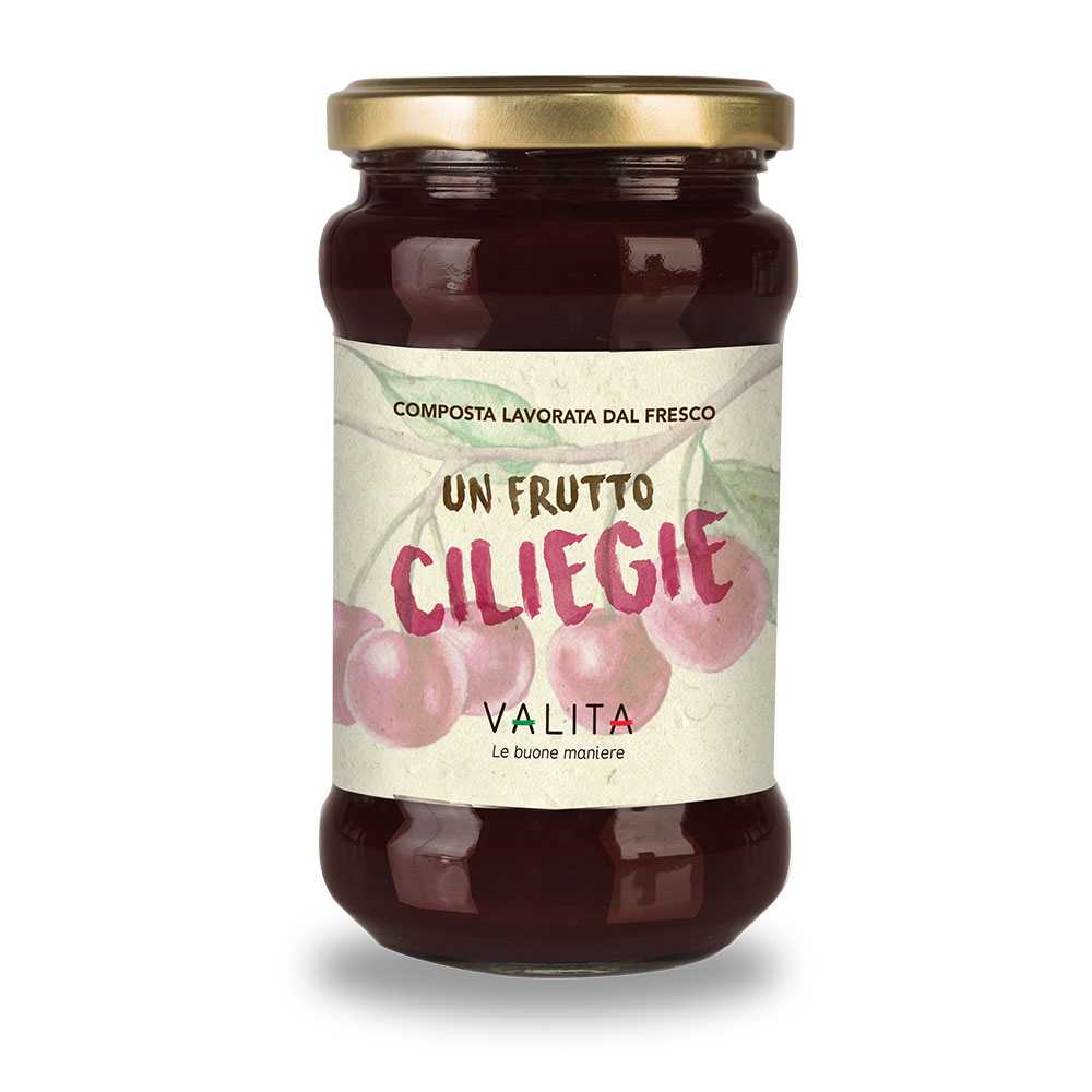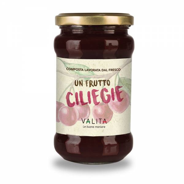 Questa composta è fatta in Piemonte con il 100% di ciliegie italiane fresche, denocciolate, cotte sottovuoto e conservate in vaso di vetro.
